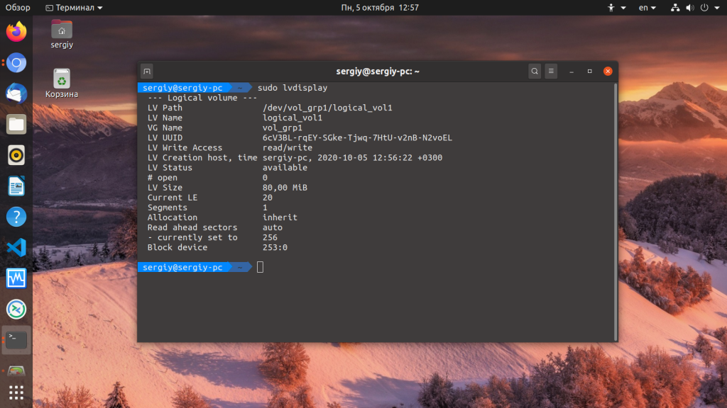 Посмотреть список доступных логических разделов LVM можно по аналогии с предыдущими разделами с помощью команды lvdisplay: