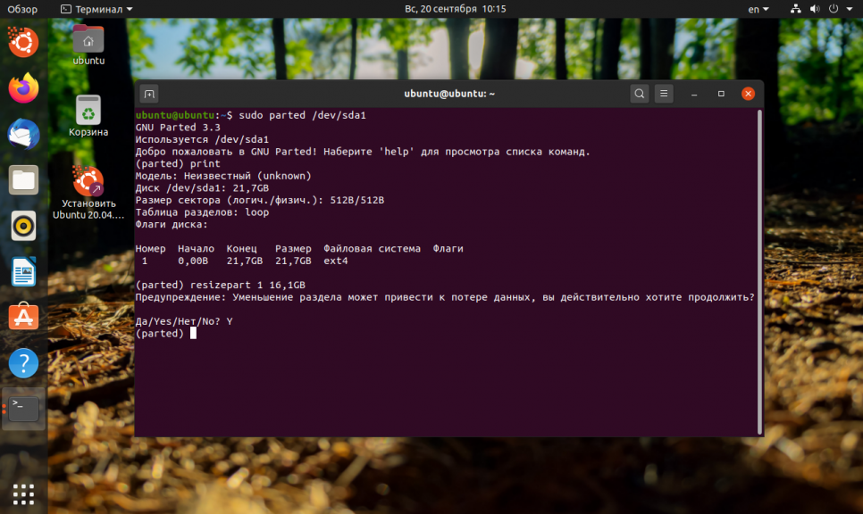 Из примера видно, что существует жесткий диск /dev/vda уже размером 20GB. На нем есть раздел /dev/vda1, который пока занимает размер в 5GB. Именно эту разницу мы и должны исправить.