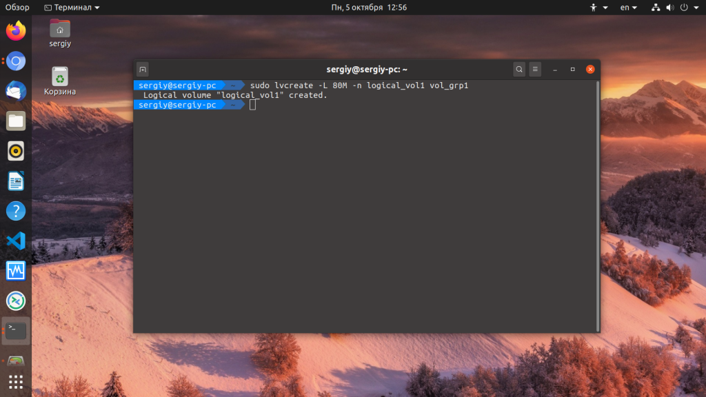 Теперь все готово, чтобы создать логические LVM разделы. Для этого будем использовать команду lvcreate и создадим логический раздел размером 80 мегабайт, или 20 блоков LVM: