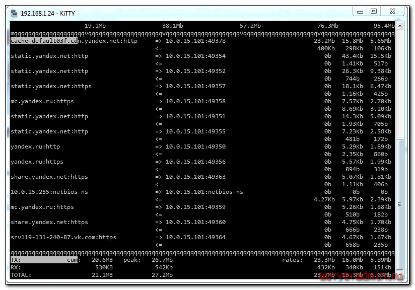 Теперь представим ситуацию, что кто-то забил весь интернет канал и вам надо быстро выяснить, кто это сделал. По-умолчанию, никаких подручных и удобных средств на шлюзе для этого нету. Установим одно из таких средств — программу iftop. Это простая консольная утилита, которая дает возможность оперативно посмотреть статистику загруженности сетевого интерфейса в реальном времени.
