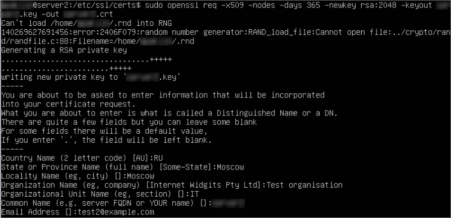 Во время выполнения команды будет задано несколько вопросов. Для «Common Name (e.g. server FQDN or Your bane)» нужно также указать имя сервера. Остальные поля заполняются произвольно (кроме «Country name» — здесь можно оставить по умолчанию).