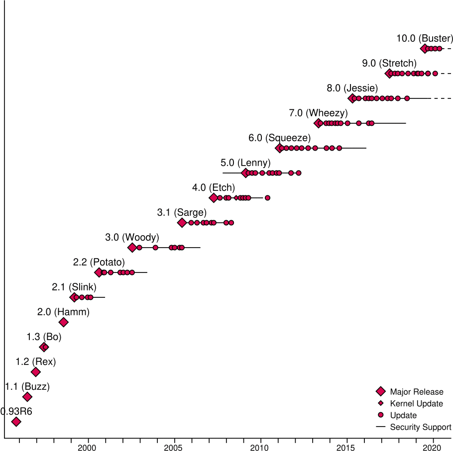 В любое время, есть один стабильный релиз Debian, который поддерживается командой безопасности Debian. Когда новая стабильная версия выпущена, как правило команда безопасности поддерживает новую/текущую версию и предыдущий релиз . Только стабильная версия рекомендуется для промышленного использования.