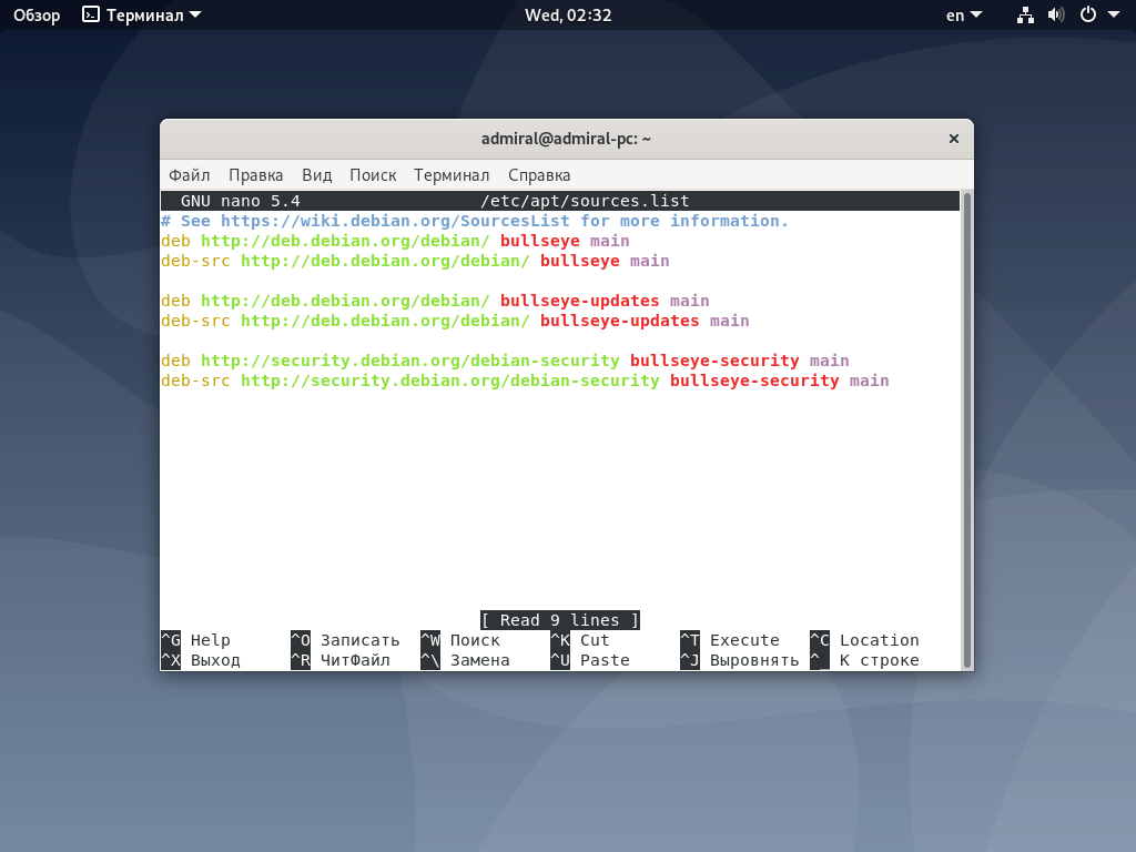 Замена репозиториев – это основной этап обновления Debian 11. Именно эти файловые серверы содержат все пакеты дистрибутива. Список репозиториев хранится в файле /etc/apt/sources.list. Для доступа к нему воспользуемся редактором nano: