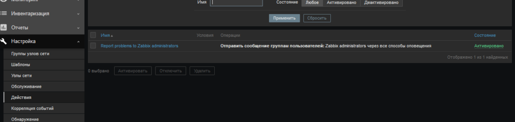 Все, отправку уведомлений мы настроили, осталось подождать срабатывания триггера, чтобы проверить. Сделаем это позже, когда подключим хотя бы один хост к мониторингу.