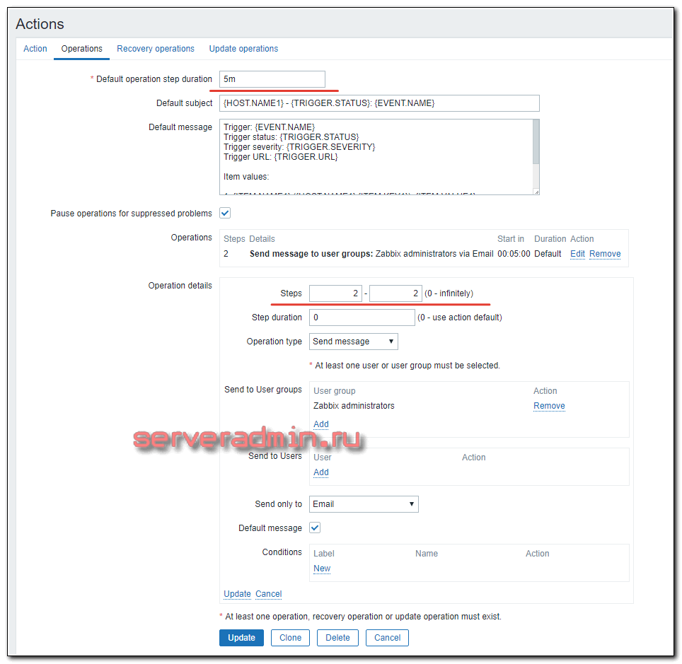 Идем во вкладку Operations и меняем Default operation step duration на 5m, если вы хотите отложить отправку оповещения на 5 минут. Далее редактируем шаг исполнения. В разделе Steps ставим значения 2 — 2. Изначально там стоит 1 — 1. То есть мы указываем, выполнить отправление со второго шага, а длину шага ранее установили в 5 минут.