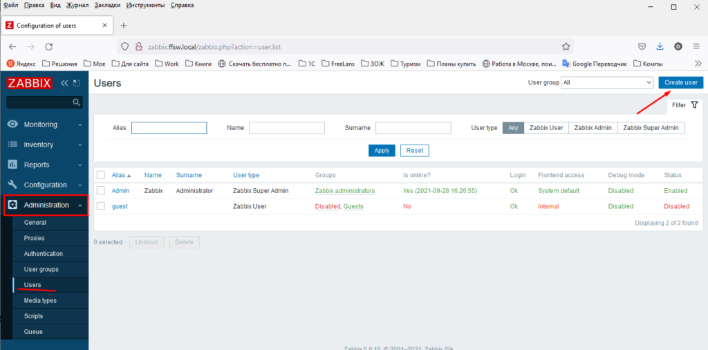 Первое, что нужно сделать после установки — сменить стандартные учетные данные для входа. Можно просто поменять пароль пользователя admin, но лучше создать новую учетную запись с правами суперпользователя, а админа удалить. Для этого идем в раздел Administration -> Users и нажимаем Create User.