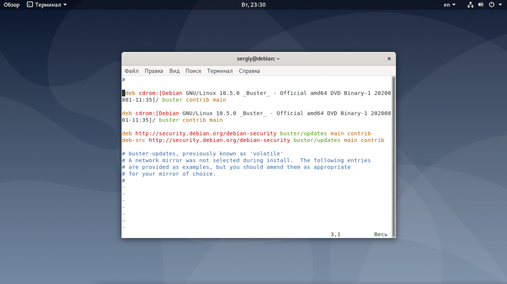 Новички часто сталкиваются с проблемой, что после установки новой системы пакетный менеджер не может найти ни одного пакета. Это связано с тем, что по умолчанию основные репозитории Debian в систему не добавлены, там есть только репозитории из DVD дисков с помощью которых вы устанавливали систему. Эта проблема очень просто решается. Системные репозитории находятся в файле /etc/apt/sources.list. Давайте сначала посмотрим на содержимое этого файла по умолчанию: