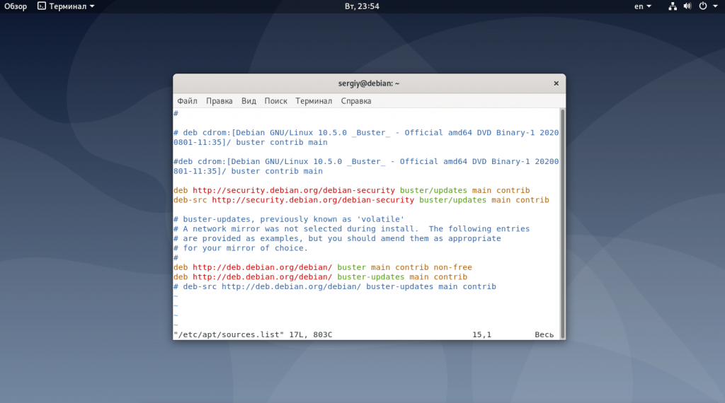 Типов репозиториев может быть два. Это deb и deb-src. Первый — для бинарных файлов, второй — для файлов исходных кодов. Дистрибутив указывает кодовое имя дистрибутива, например, для Debian 10 — это buster, для девятой версии stretch. Для стабильных обновлений есть еще один репозиторий, где вместе с кодовым именем дистрибутива указывается слово updates, например: buster-updates.