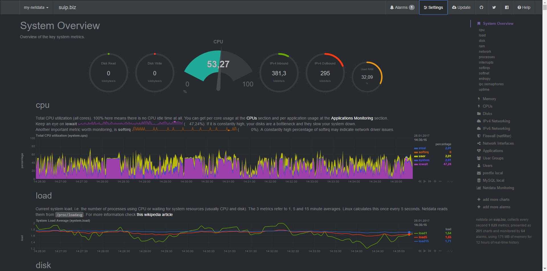 Monitorix – это бесплатная, не требовательная к ресурсам утилита, которая предназначена для контроля за системой и сетевыми ресурсами в серверах Linux/Unix настолько, насколько это возможно. Она имеет встроенный HTTP веб-сервер, которые регулярно собирает системную и сетевую информацию и отображает её в графиках. Программа следит за нагрузкой на систему и использованием ресурсов, распределением памяти, здоровьем диска, системными сервисами, сетевыми портами, почтовой статистикой (Sendmail, Postfix, Dovecot и пр.), MySQL статистикой и многим другим. Программа предназначена для контроля общей производительности системы и помогает в обнаружении сбоев, узких мест, аномальной активности и т.д.