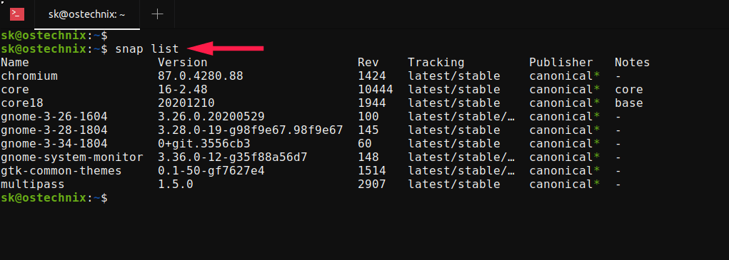 Чтобы вывести список всех приложений Snap, установленных в вашей системе, запустите: