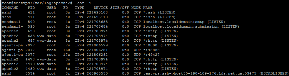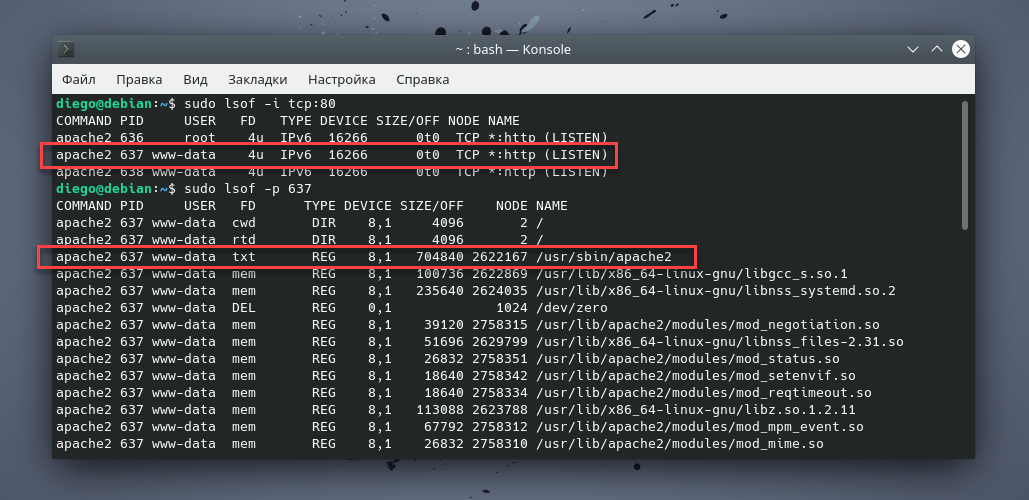 Имя файла в списке открытых файлов помогает точно определить происхождение процесса, в частности, мы теперь знаем, что это веб-сервер Apache.