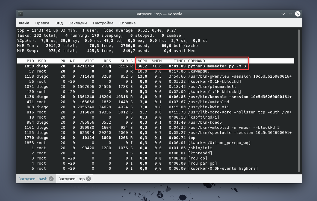 Команда top отображает и обновляет отсортированную информацию о текущем процессе (или процессах). Используйте её, чтобы определить, какие процессы в данный момент запущены и сколько памяти и ресурсов процессора они потребляют. Обычно бывает так, что вы запускаете приложение, и оно через минуту «умирает». Проверив соответствующий лог-файл, вы замечаете запись, указывающую на ошибку памяти: