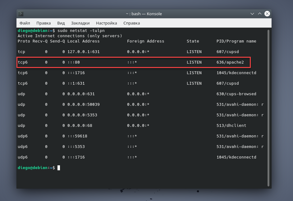 Предположим, вы проводите локальные эксперименты со своей программой, принимающей входящие подключения от других программ. Может случиться так, что вы получите сообщение об ошибке типа «Необходимый вам порт (или адрес) уже занят». Применив команду с параметрами протокола, процесса и порта, мы увидим, что HTTP-сервер Apache уже использует 80 порт на нижеприведенном хосте: