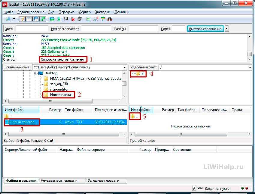 В правом верхнем окне программы получаем основную директорию удалённого сайта (4 на скриншоте). В правом нижнем окне программы получаем папку (можем выбирать), куда будем загружать наш файл (5 на скриншоте).