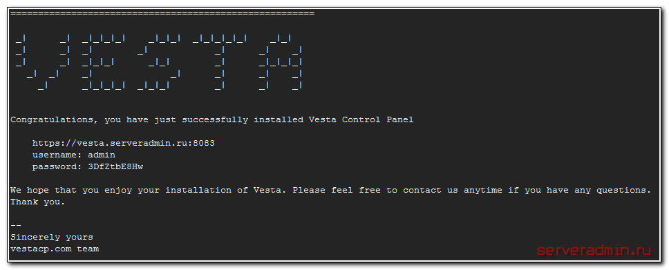 Если все верно, то подтверждайте и продолжайте установку. Скрипт запустит пакетный менеджер дистрибутива и начнет установку необходимых программ из различных репозиториев. Далее он будет подгружать свои конфиги и скрипты для запуска служб, которыми будет управлять. В конце установки вы увидите адрес панели vestacp, имя пользователя и пароль для входа.