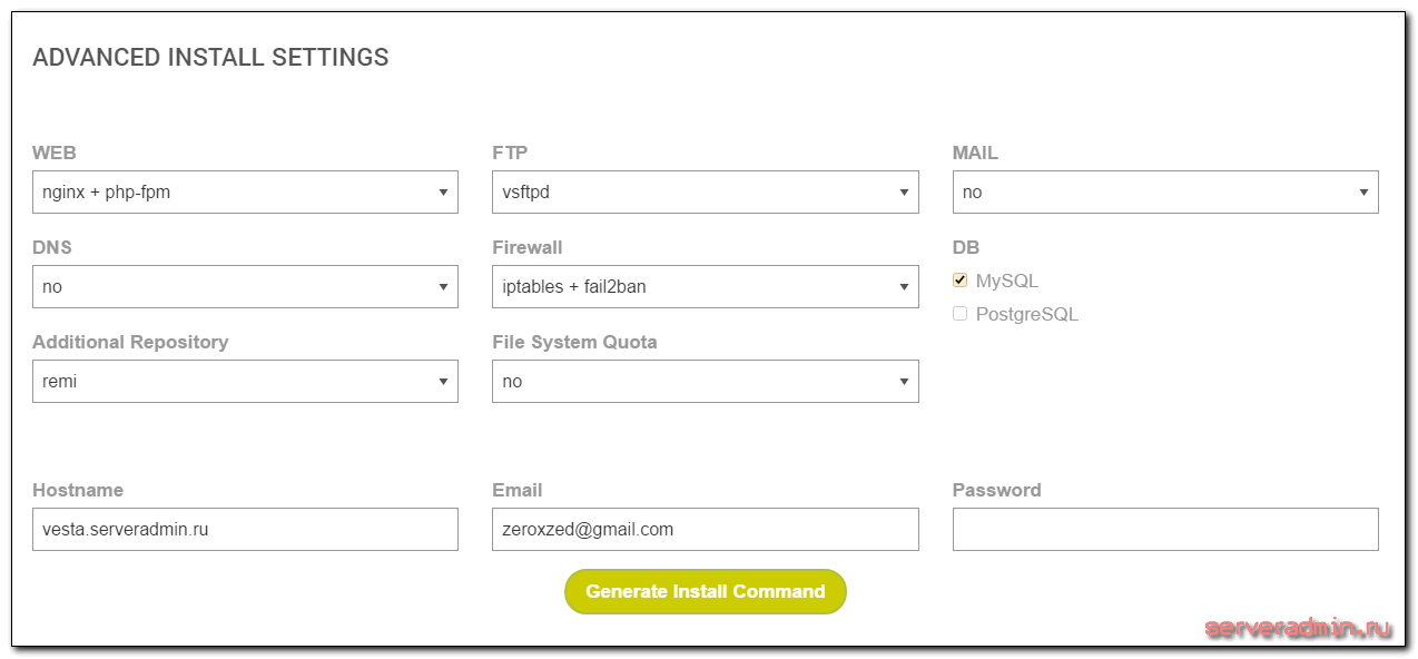 # cd /tmp # curl -O http://vestacp.com/pub/vst-install.sh # bash vst-install.sh --nginx yes --phpfpm yes --apache no --named no --remi yes --vsftpd yes --proftpd no --iptables yes --fail2ban yes --quota no --exim no --dovecot no --spamassassin no --clamav no --mysql yes --postgresql no --hostname vesta.serveradmin.ru --email zeroxzed@gmail.com