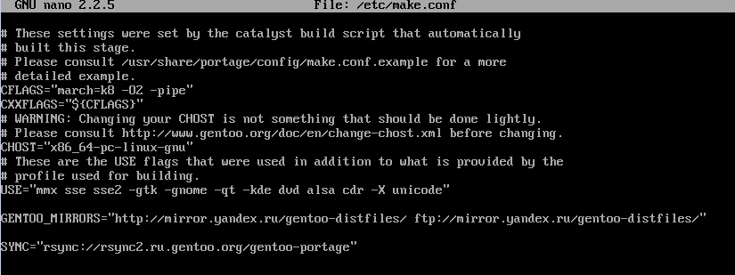 Обновите /mnt/gentoo/etc/portage/make.conf файл в соответствии с личными предпочтениями и сохраните изменения (в nano нужно нажать Ctrl+x).