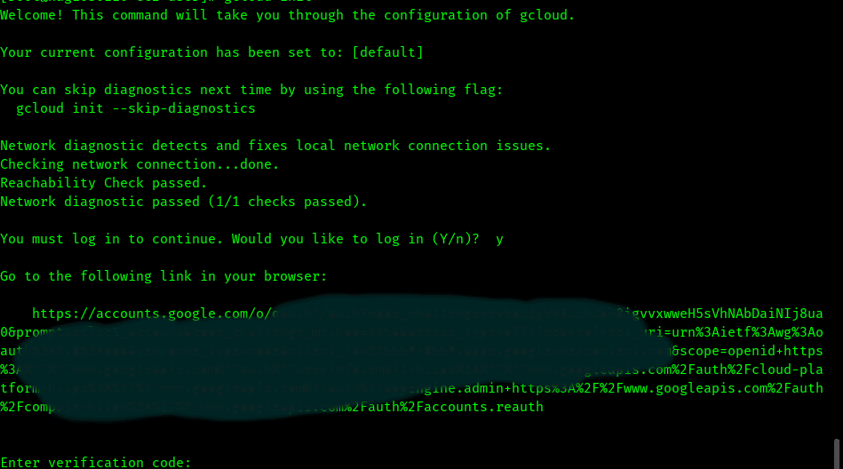 Paste this code to the terminal window & we will be logged in to Google-cloud-SDK on that system. Google init command will then ask to select the project, region, etc. Select those & we are ready to use the Google cloud sdk commands.