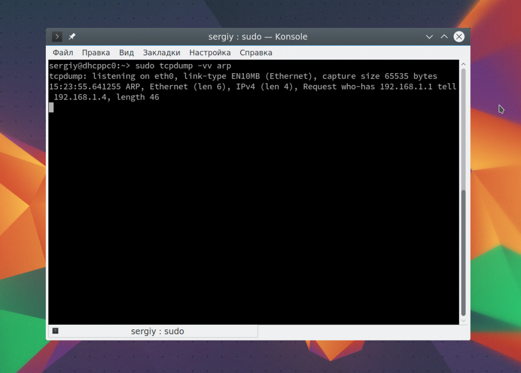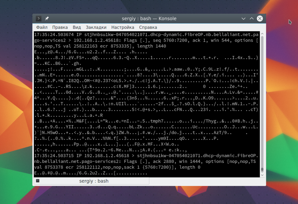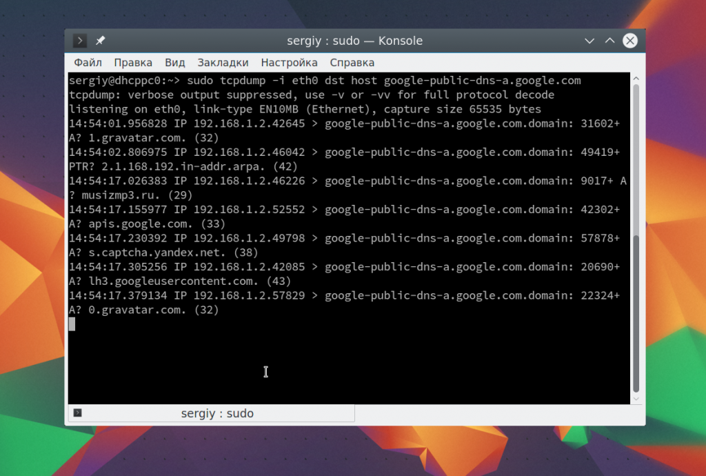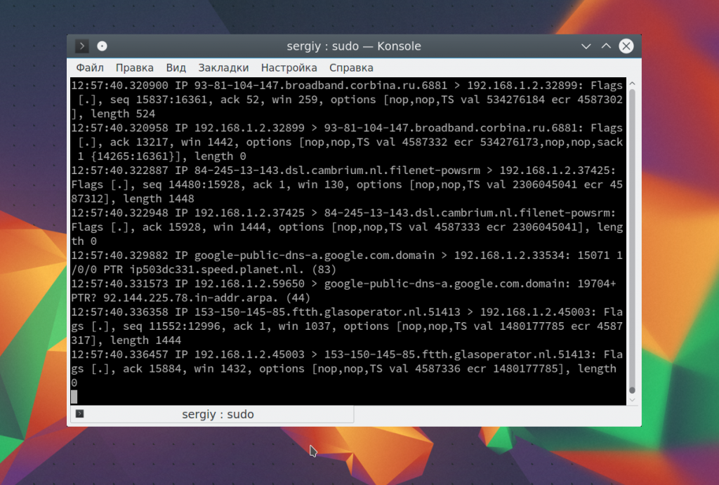 Чтобы остановить работу команды нажмите Ctrl+C. В выводе вы сразу же увидите все перехваченные пакеты. Формат записи для каждого пакета будет выглядеть следующим образом: