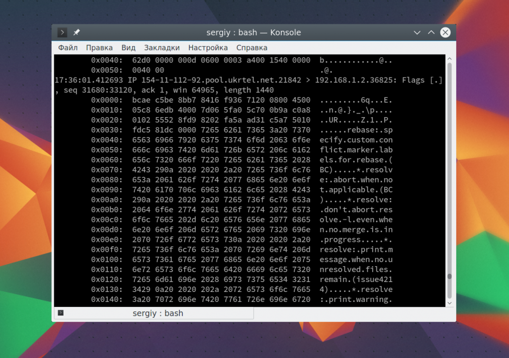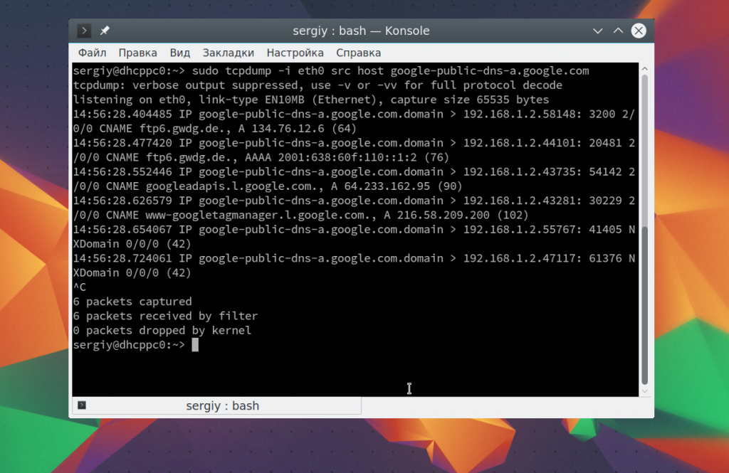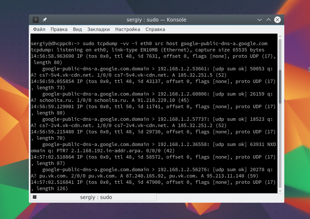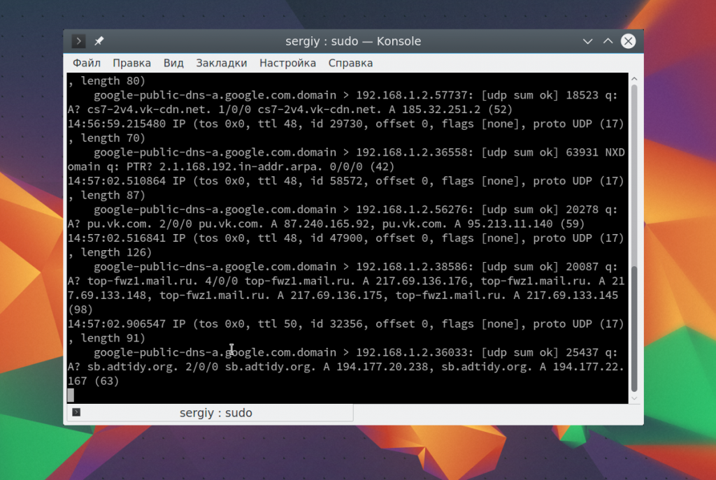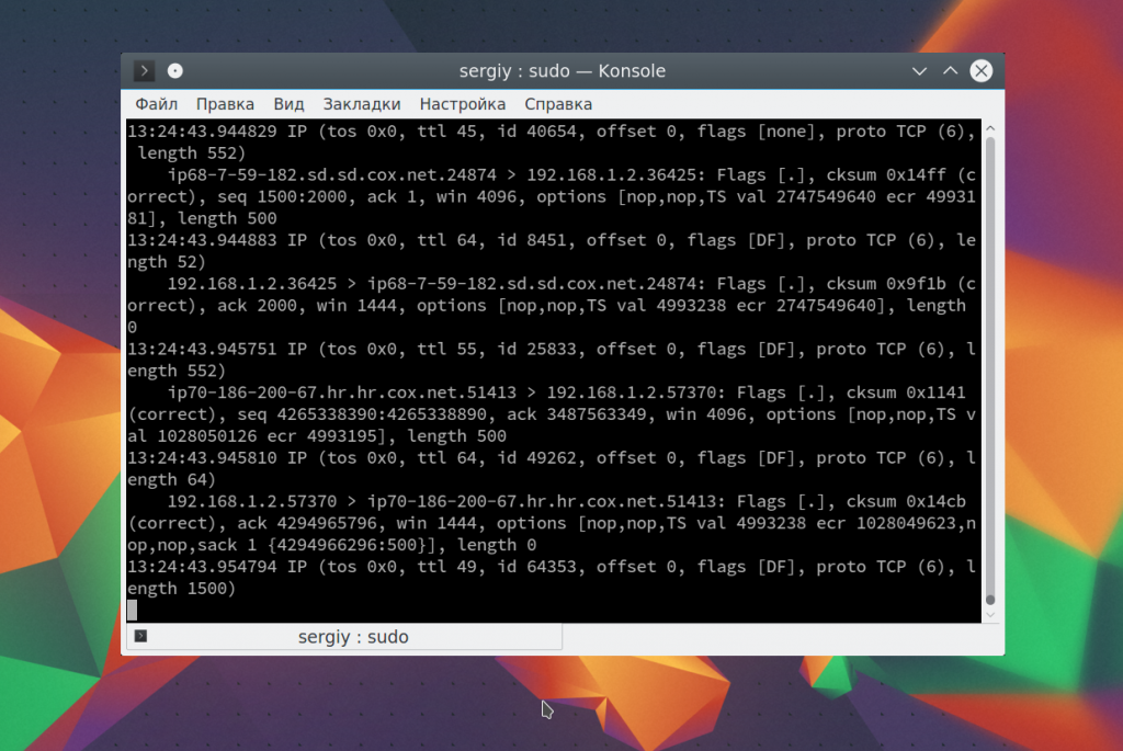 Чтобы остановить работу команды нажмите Ctrl+C. В выводе вы сразу же увидите все перехваченные пакеты. Формат записи для каждого пакета будет выглядеть следующим образом: