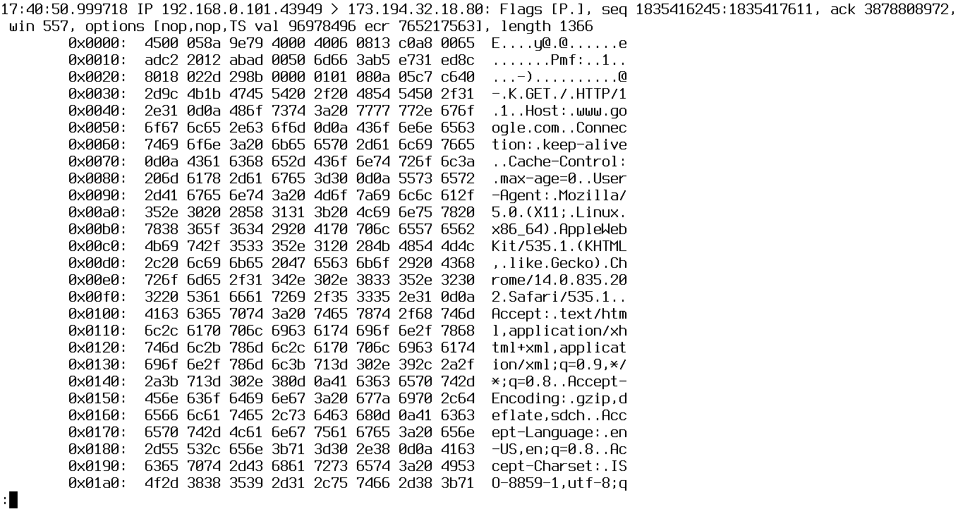 В арсенале tcpdump есть поддержка многих протоколов, благодаря чему он может представить в читаемом виде информацию о протоколах TCP, UDP и ICMP, SMB/CIFS, NFS, AFS, AppleTalk. Но что, если tcpdump ничего не знает об используемом протоколе прикладного уровня или не может определить его? В обычной ситуации он просто выведет информацию о пакете. Она может выглядеть примерно так: