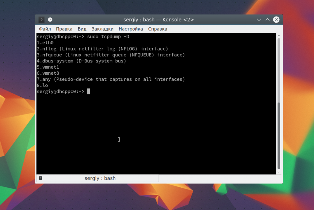 Перед тем как перейти к использованию tcpdump нужно посмотреть какие сетевые интерфейсы вы можете использовать. Для этого запустите команду с опцией -D: