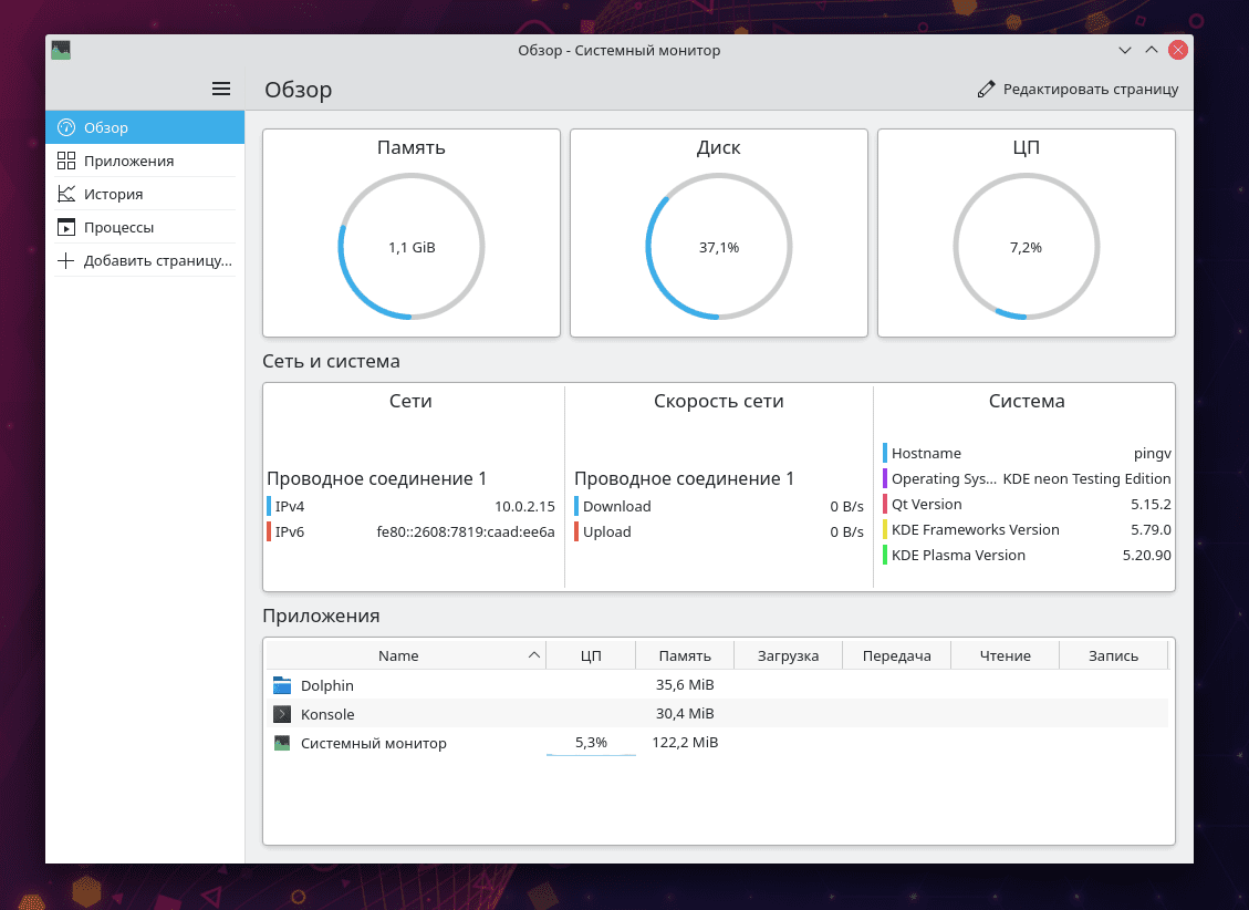 Появился новый Системный монитор. Это приложение для отслеживания использования системных ресурсов и просмотра статистики.