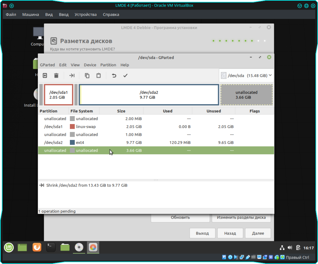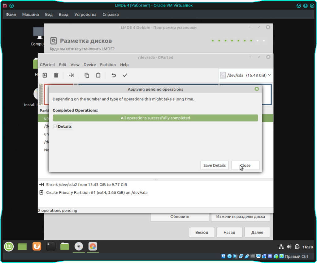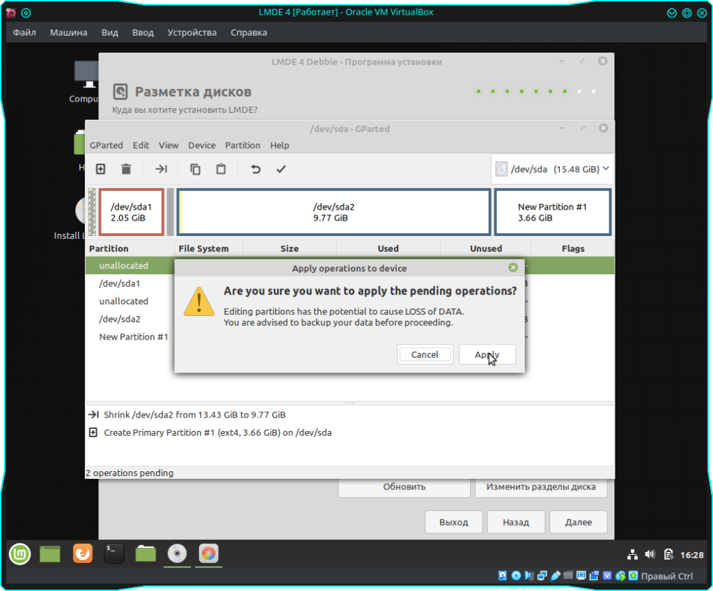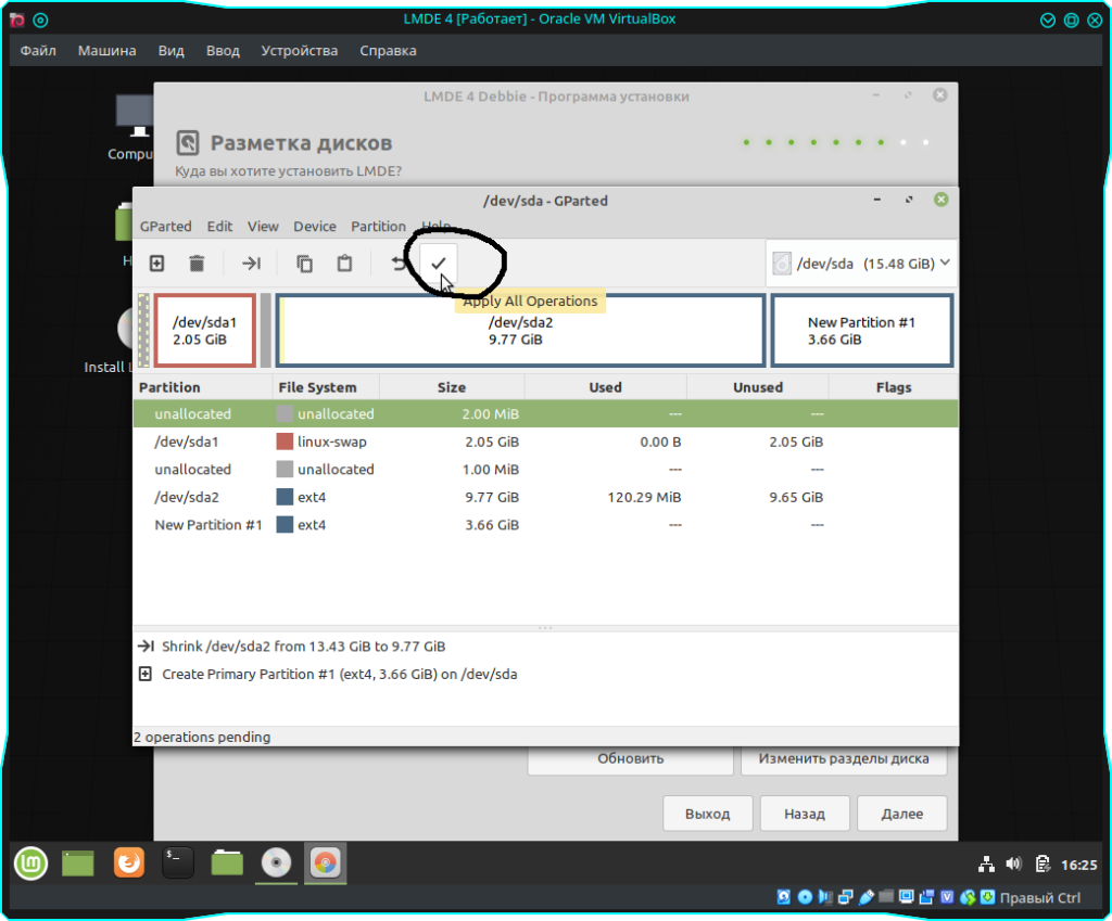 После проделанных действий нам нужно нажать на галочку, что бы применились все изменения. Далее просто подтверждаем наши намерения нажав на кнопку “Apple” и после применения можно закрывать GParted: