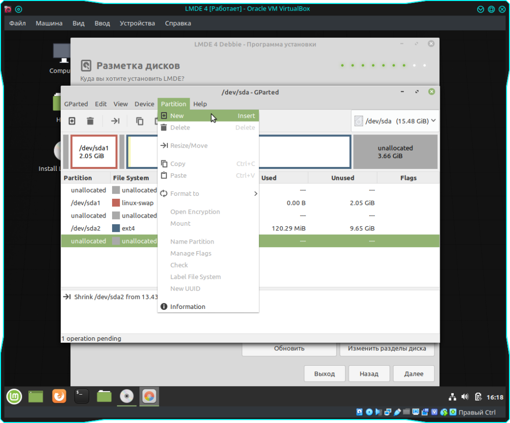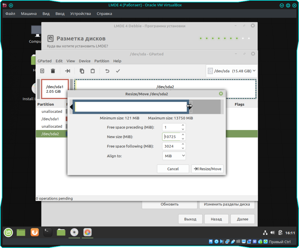 Далее при помощи ползунка или же можно в поле “New size” выбрать объем раздела под Root. То есть, под корень системы. На собственном опыте могу посоветовать выделить под данный раздел от 40 до 50 гигов. Больше не имеет смысла. После чего нажимаем кнопку “Resize/Move”. Так как я ставлю на виртуальную машину и у меня жесткий диск всего 15 гигабайт, то под корень я отведу 10 гигабайт.