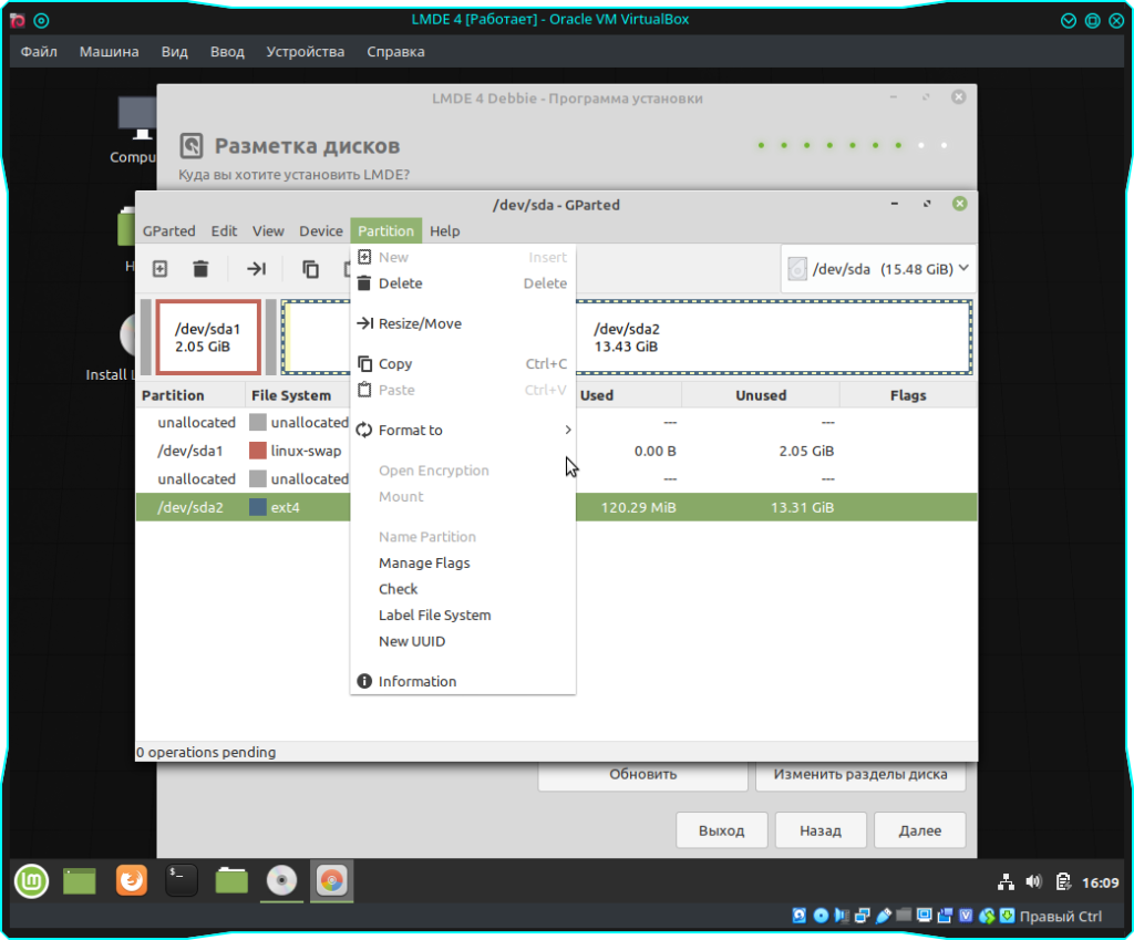 Далее нажимаем кнопку “Обновить” и видим созданные разделы. После чего дважды щелкаем мышкой на первом созданном разделе и в поле “Точка монтирования” указываем слэш “/”, тем самым мы создаем корень нашей системы. А в поле “Форматировать” указываем “ext4” или же иную файловую систему, которую вы предпочитаете.