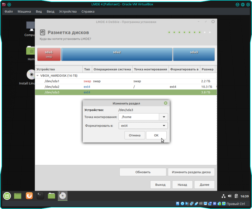 Тоже самое проделываем и со вторым разделом. Только в поле “Точка монтирования” выбираем “home”, а так же, в поле “Форматировать” выставляем нужную вам файловую систему, в моем случае это “ext4”: