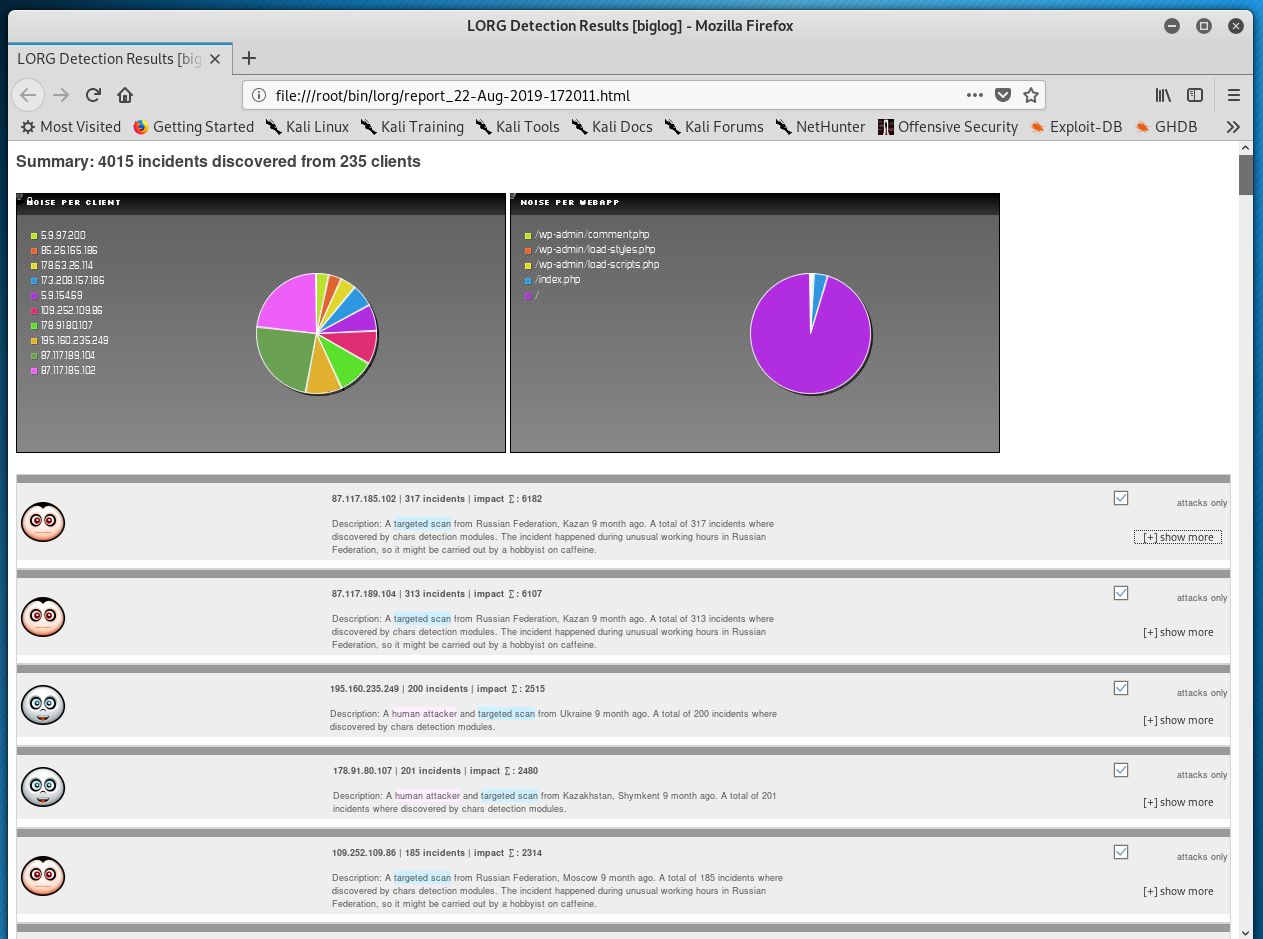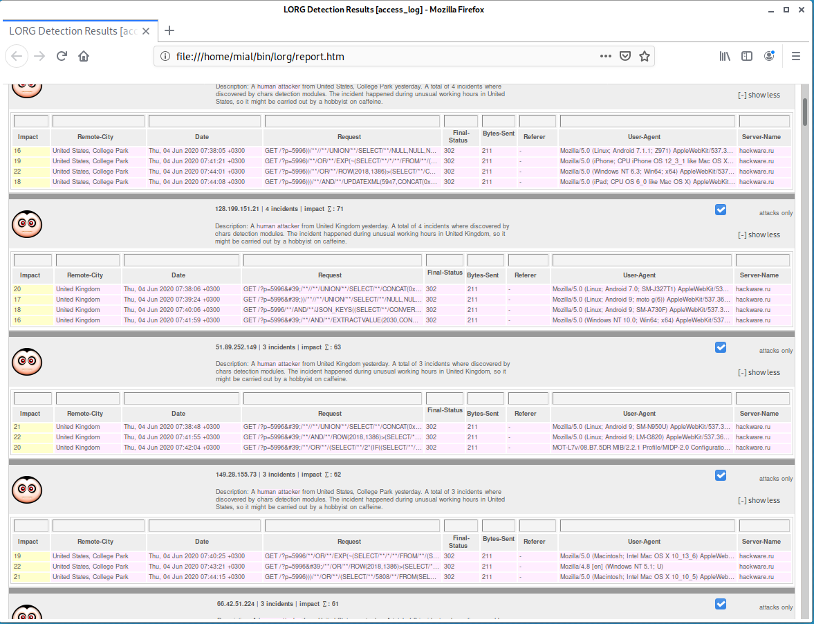 LORG — анализатор безопасности лог файлов Apache, это инструмент для расширенного анализа безопасности журналов HTTPD. Он нацелен на реализацию различных современных подходов к обнаружению атак на веб-приложения в журналах HTTP-трафика (например, в журналах доступа Apache (файлы access_log)), включая методы на основе сигнатур, статистики и машинного обучения. Обнаруженные инциденты впоследствии группируются в сеансы, которые классифицируются как «ручные» или автоматизированные, чтобы определить, является ли злоумышленник человеком или машиной. Кроме того, могут быть выполнены геотаргетинг и поиск DNSBL, чтобы увидеть, происходят ли атаки с определённой геолокации или ботнета. Кроме того, атаки могут быть определены количественно с точки зрения успеха или неудачи на основе аномалий в пределах размера ответов HTTP, кодов ответов HTTP или активного воспроизведения подозрительных запросов.