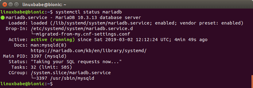 The package will be installed automatically with the MariaDB server. Once the installation finishes, MariaDB server automatically starts. You can check its status with:
