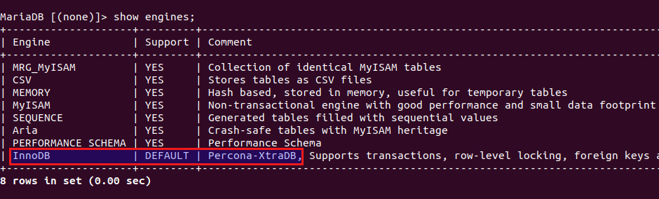 By default, until MariaDB 10.1, MariaDB uses the XtraDB storage engine, a performance enhanced fork of the InnoDB storage engine from MySQL. However, over time, MySQL has implemented almost all of the improvements. InnoDB has caught up, so from MariaDB 10.2, InnoDB is the default engine.