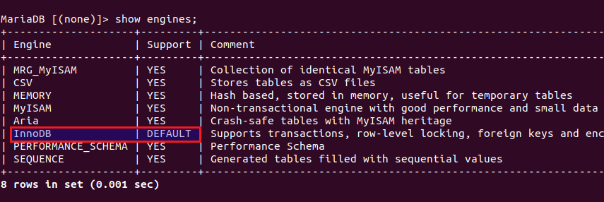 To check which is the default storage engine, log into MariaDB monitor and run the following command.