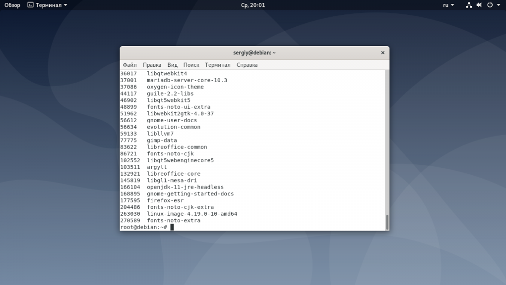 Одно дело когда ненужная программа занимает несколько мегабайт, тогда ее можно и оставить, на случай если вдруг когда пригодится, но вот если программа не нужна и занимает много, ситуация совсем другая, это ведь все таки очистка Debian от мусора. Чтобы найти все самые большие пакеты выполните команду:
