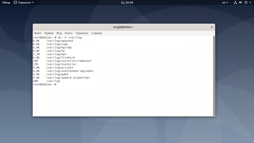 Нам нужно оценить насколько успешно прошла очистка диска Debian. Сначала давайте посмотрим сколько места занимают все файлы на жестком диске вашего сервера: