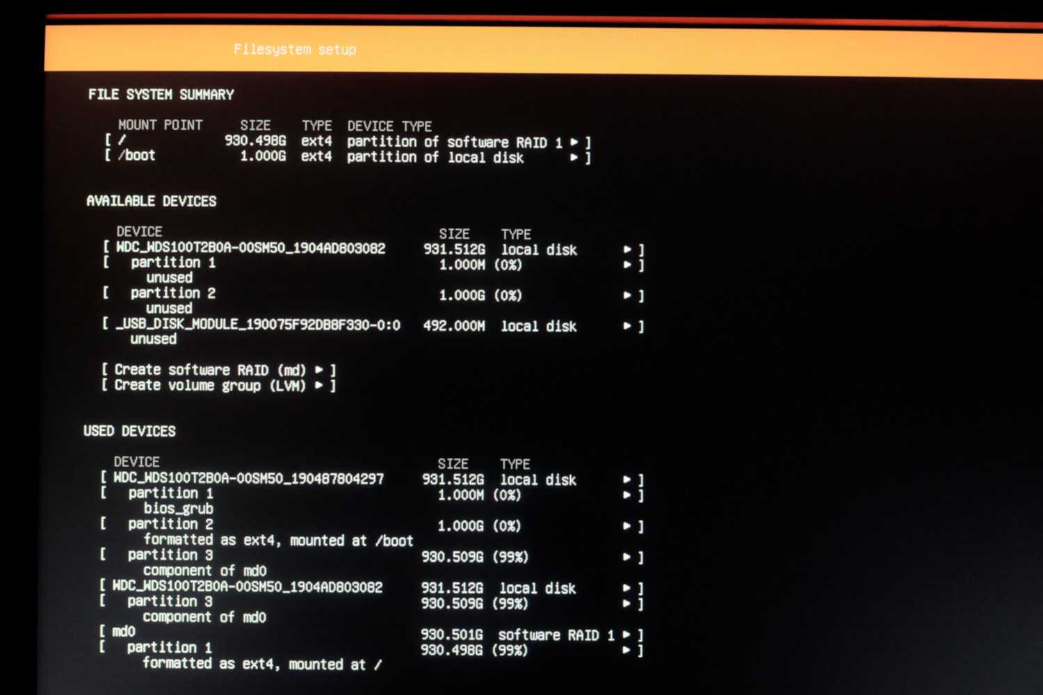 В этом NAS-е есть постоянная память размером 512 МБ куда установлена дефолтная прошивка. Ее я не перезаписывал (при желании можно будет вернуться на нее), и поставил Ubuntu 18.04 на software RAID, собранный из двух установленных дисков. На каждом диске создается по партиции одинакового размера, и они объединяются в RAID1. На одном диске также раздел для загузчика и /boot: