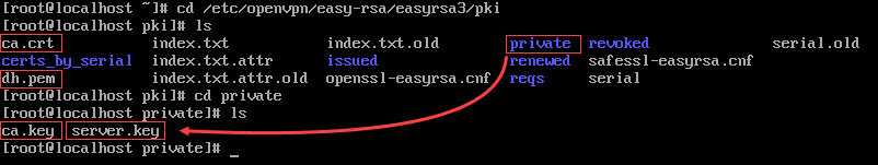 $ cd ~/openvpn-ca/keys $ sudo cp ca.crt ca.key server.crt server.key ta.key dh2048.pem /etc/openvpn