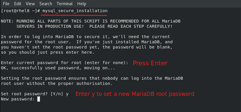 When it asks you to enter MariaDB root password, press Enter key as the root password isn’t set yet. Then enter to set the root password for MariaDB server.