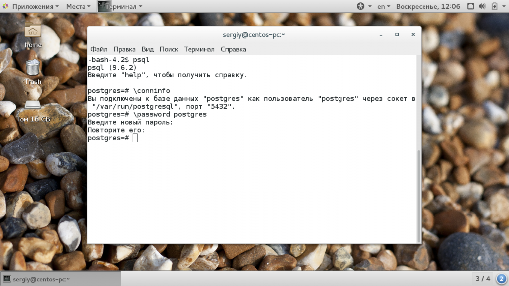 7) Задаем пароль пользователю postgres, для того чтобы была возможность подключаться к серверу удаленно.
