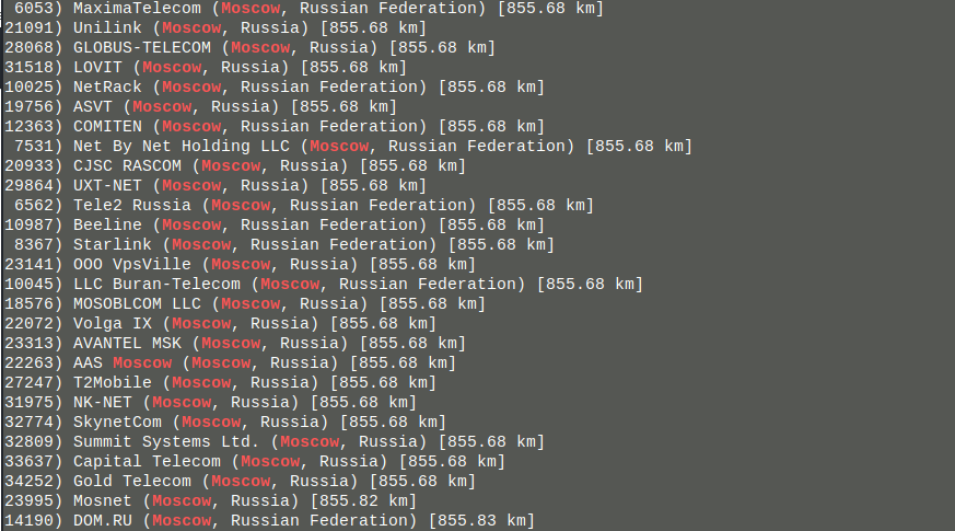 Посмотреть список доступных серверов можно с помощью параметра , но вывод будет очень большой, для сокращения воспользуемся программой grep и отфильтруем по определенному городу:
