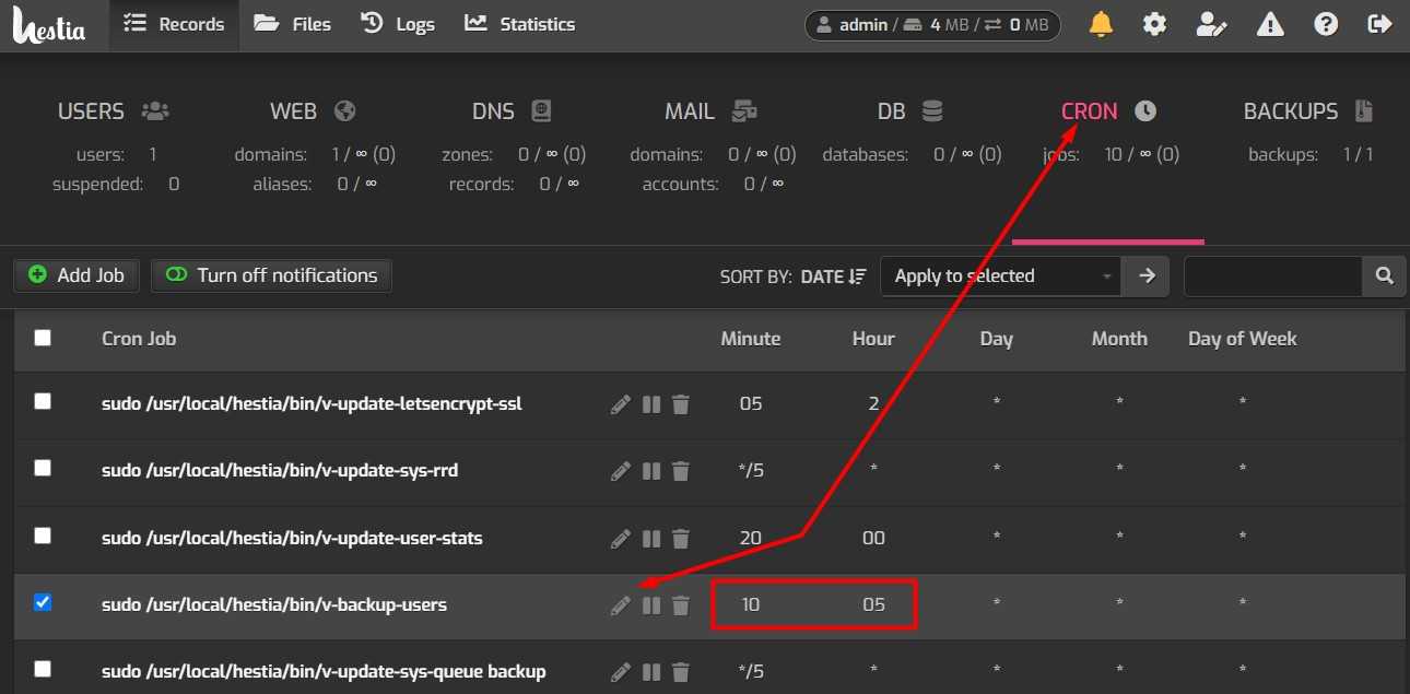 - Что бы резервное копирование выполнялось автоматически, необходимо настроенное задание в CRON. По умолчанию резервное копирование происходит в 5:10 утра по времени вашего сервера. Но если вы хотите поменять настройки запуска, вам следует на странице CRON найти скрипт v-backup-users и нажать кнопку конфигурирования.