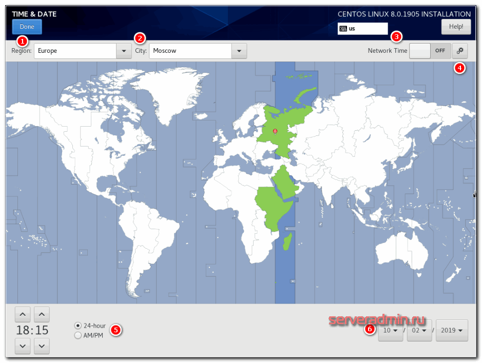 Данные для следующего этапа некоторое время заполняются значениями по умолчанию. Большинство пунктов можно не трогать — это Keyboard, Language Support, Installation Source, Software Selection, KDUMP и Security Policy. За исключением клавиатуры и языка, альтернатив особо и нет. Сначала настраиваем время (фактически просто выбираем часовой пояс):