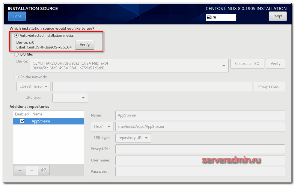 Далее нужно указать, откуда будет производиться установка. Как я уже говорил, в данном примере я использую полный iso образ dvd1, который позволяет выполнить установку centos 8 полностью локально. Сетевую установку я рассмотрю отдельно позже. Так что в данном случае нам ничего отдельно настраивать не надо, по-умолчанию и так выбран виртуальный cd-rom в виде устройства sr0 в качестве источника.