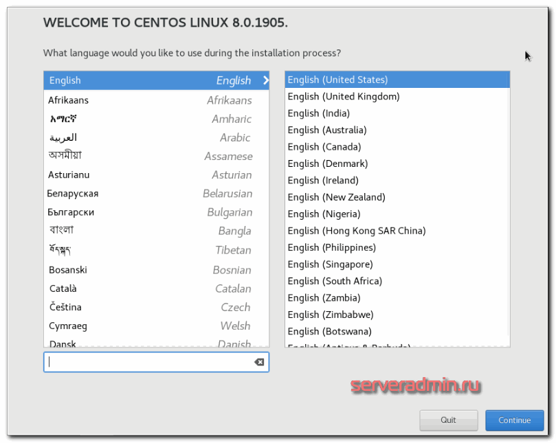 На первом экране, соответственно, выбираем Install CentOS 7. После загрузки установщика мы довольно неожиданно попадаем в весьма симпатичную графическую оболочку. Именно для нее потребовалась мышь типа «USB планшет». Теоретически можно выбрать русский язык, но «для полноты ощущений» предлагаю оставить английский: