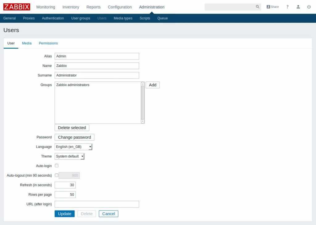 Управление системой так же осуществляется через веб интерфейс: именно там создаются и настраиваются группы, серверы, сбор параметров, триггеры и прочее. Возможно создание множества аккаунтов с разными уровнями доступа.
