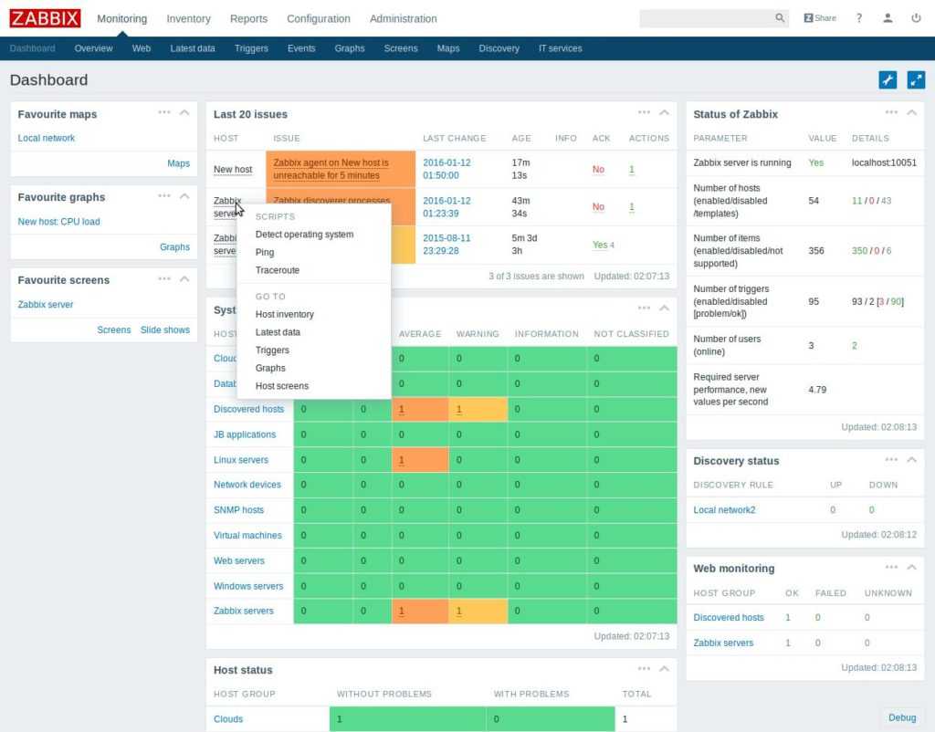 Взаимодействие пользователей с самой системой мониторинга происходит через веб-панель, на которой сгруппированы все элементы управления. На главном экране отображается основная информация: состояние узлов сети и индикаторы состояния триггеров.