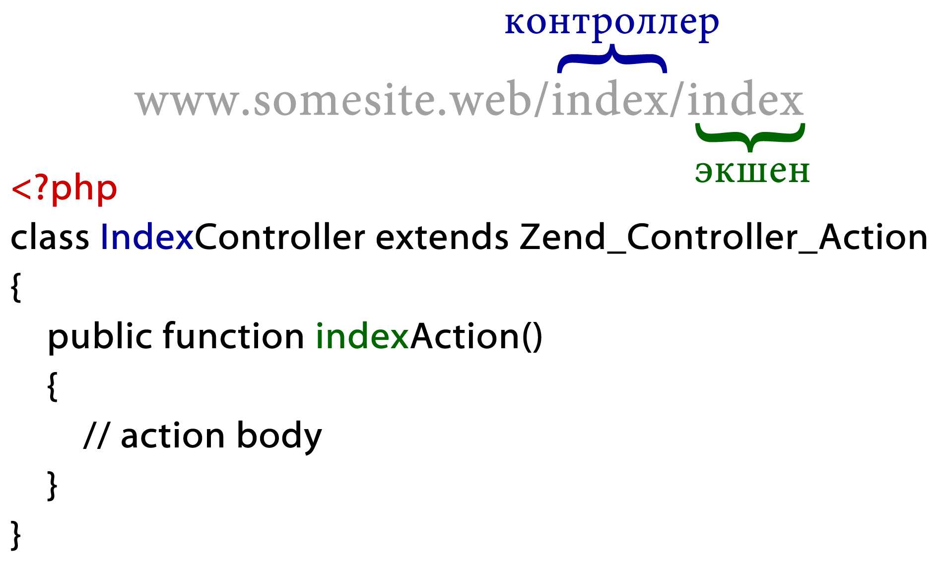 Каждый контроллер включает в себя набор действий или другими словами actions. Action это функция с модификатором доступа public, которая представляет собой страницы вашего сайта. Именуются они тоже строго: {имя_действия}Action. К примеру indexAction(), printAction() и т.д. Название действия начинается с прописной буквы!