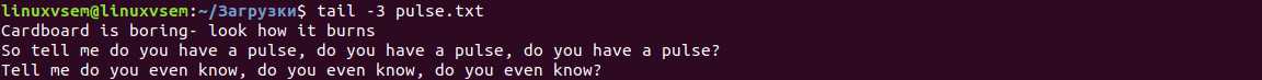 Покажем на экране пять последних строк. Для этого будем использовать аргумент «-n».